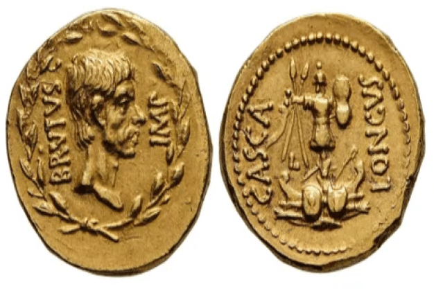 El reverso de la moneda incluye dos proas de barco unidas (la parte más delantera de la proa), que representan las victorias navales de Bruto y Casio en el año 42 a. C., dijo Carbone. Irónicamente, “las victorias celebradas en este áureo fueron la causa directa de su derrota final en Filipos”, dijo, porque estaban al límite de sus posibilidades al luchar en dos frentes. Además, el reverso hace referencia a Publio Servilio Casca Longo, uno de los co-conspiradores y posiblemente la primera persona en apuñalar a César.