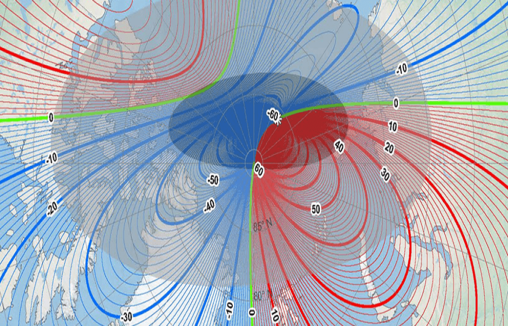 Los expertos de la Administración Nacional Oceánica y Atmosférica de los Estados Unidos (NOAA) y el Servicio Geológico Británico (BGS) han unido sus fuerzas, como lo hacen cada cinco años, para producir un nuevo Modelo Magnético Mundial (WMM por sus siglas en inglés) más preciso. Mientras que el Polo Norte geográfico permanece fijo en su lugar (en la cima del eje de rotación de la Tierra), el WMM señala el Polo Norte magnético, donde el campo magnético de la Tierra apunta directamente hacia abajo, un campo magnético perfectamente vertical.