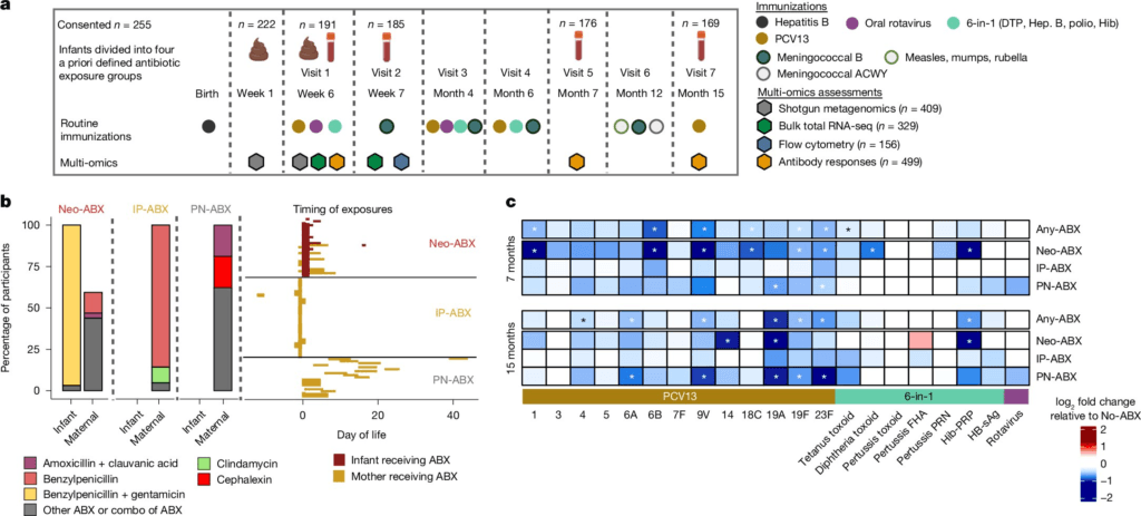 Para monitorear los cambios en el microbioma intestinal y las respuestas inmunitarias relacionadas con la vacuna a lo largo del tiempo, se recogieron muestras de heces a los siete días y a las seis semanas de edad, mientras que se tomaron muestras de sangre en varios momentos entre las seis semanas y los 15 meses. Para evitar sesgos durante la recolección y el análisis de las muestras, los investigadores que las recogieron desconocían qué bebés pertenecían a qué grupo de exposición.