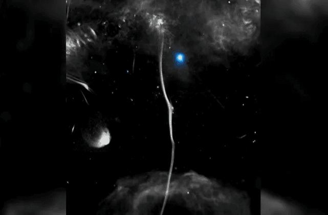 El “hueso” cósmico que se muestra aquí es G359.13142-0.20005 (G359.13 para abreviar, o a veces llamado la Serpiente), y es uno de los filamentos centrales galácticos más brillantes y largos que hemos detectado. Ubicado a unos 26.000 años luz de la Tierra, tiene una longitud de unos 230 años luz. Los científicos sospechan que el púlsar impactó contra G359.13 a una asombrosa velocidad de entre 1,6 millones a 3,2 millones de kilómetros por hora.