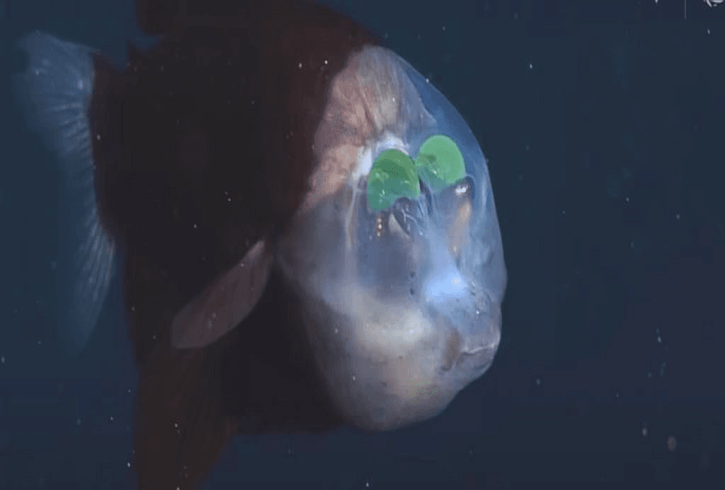 La mayoría de los animales con ojos los tienen ubicados en algún lugar de la superficie de la cara, pero el barreleye es muy diferente. Sus ojos están en la cara, dos ojos tubulares rematados con cúpulas extremadamente sensibles a la luz, que apuntan hacia arriba y están alojados en la cabina transparente y llena de líquido de su frente.
