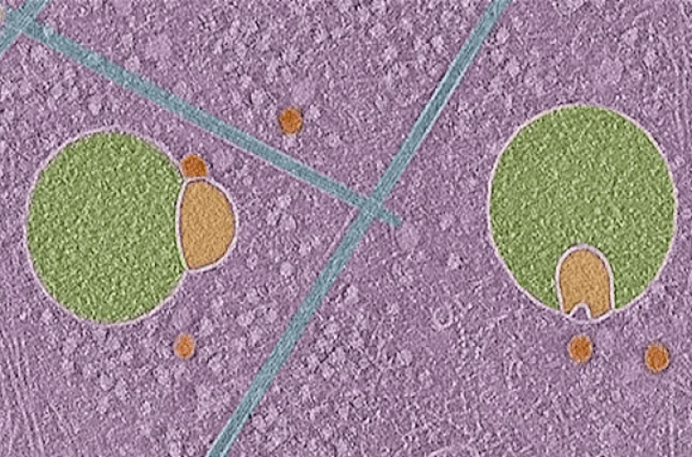 Ebrahim y sus colegas observaban una configuración de vesículas que nunca antes habían observado. Las vesículas son estructuras con forma de globo que se utilizan para transportar sustancias como proteínas y hormonas dentro y entre las células. El nuevo estudio reveló dos vesículas fusionadas con una barrera de grasa de dos capas entre ellas.