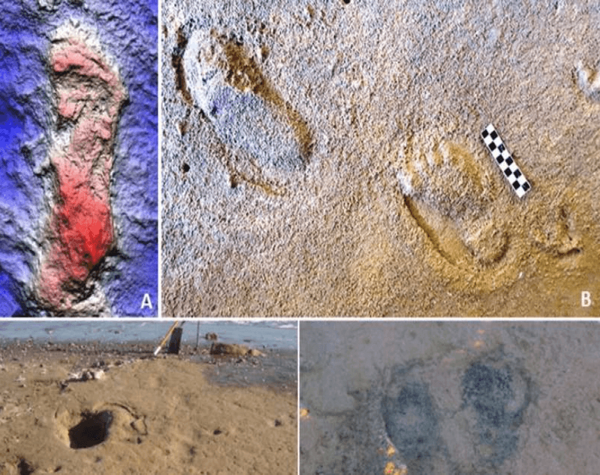Las huellas fosilizadas se descubrieron en dos yacimientos. La más antigua es una única huella procedente de Praia do Telheiro, con una antigüedad estimada de unos 82.000 años. El conjunto más reciente, de unos 78.000 años, consta de diez huellas dejadas en una duna por tres individuos en el cercano Monte Clérigo.