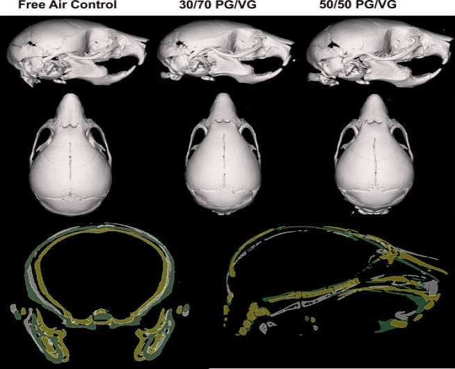 Las hembras fueron expuestas a estas tres condiciones diferentes a una velocidad de una bocanada por minuto, cuatro horas por día, cinco días a la semana durante el embarazo de aproximadamente 20 días. Se escaneó la anchura y la altura craneales de las crías de ratón dos semanas después del nacimiento. El análisis mostró una reducción estadísticamente significativa de las medidas en las crías de ratones preñados expuestos a la mezcla 30/70 de PG/VG, considerada más segura, en comparación con los ratones expuestos al aire libre y a la fórmula 50/50.
