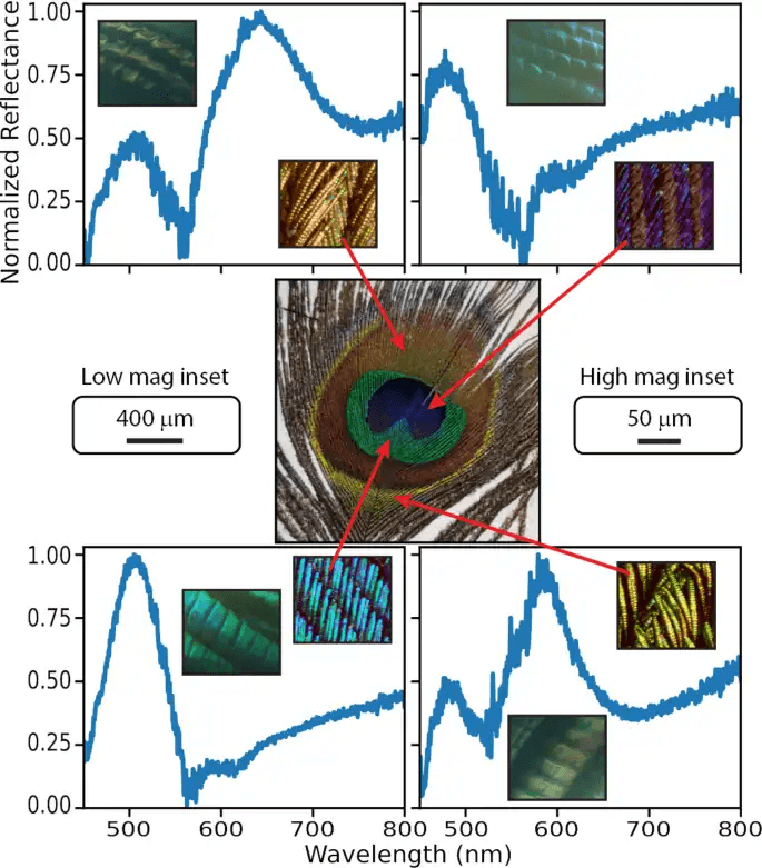 En las plumas de pavo real, estas estructuras se encuentran dentro de finos filamentos conocidos como bárbulas. Estas disposiciones periódicas funcionan como cristales fotónicos naturales: materiales que permiten el paso de ciertas longitudes de onda de luz, mientras que excluyen otras.