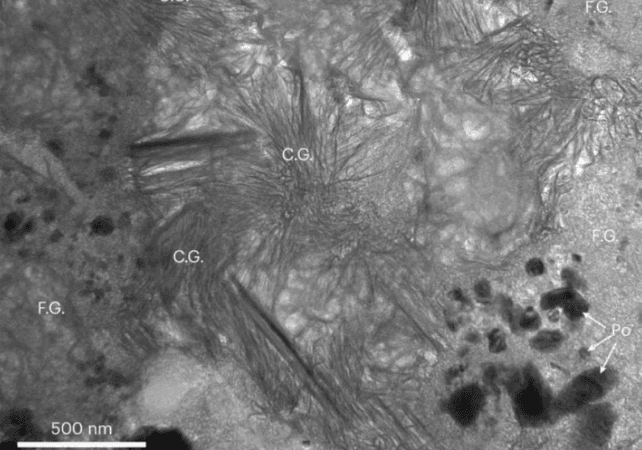 Imagen de microscopio electrónico de una muestra de Bennu que muestra silicatos laminares hidratados de grano grueso (CG) y grano fino (FG) formados en presencia de agua. El agua provino del hielo de Bennu, fundido por el calor remanente o el calor de las colisiones. Zega et al., NatGeo, 2025.