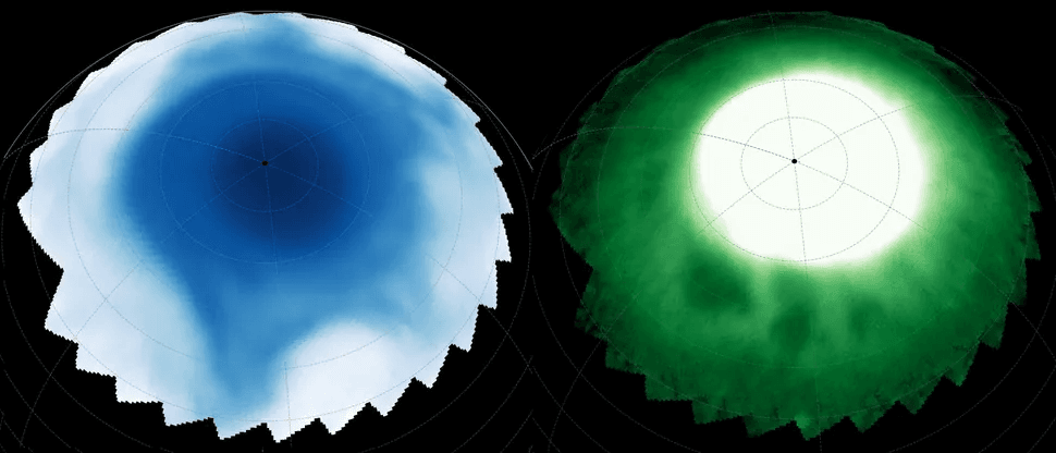 Los astrónomos esperaban observar emisiones en amplias bandas del espectro infrarrojo en las capas atmosféricas sobre el vórtice. Sin embargo, lo que observaron fueron formaciones oscuras con forma de cuentas —separadas por grandes distancias, pero posiblemente interconectadas— que se desplazaban lentamente en el plasma cargado de la ionosfera del planeta, y una estructura estelar asimétrica en la estratosfera inferior. Publicaron sus hallazgos el 28 de agosto en la revista Geophysical Research Letters.