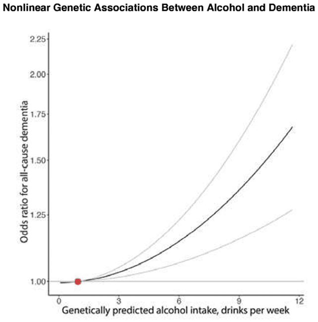 En esta parte del análisis, la forma de U desapareció. Cuanto mayor era el consumo de alcohol previsto, mayor era el riesgo de demencia, sin disminución para los bebedores moderados que disfrutaban de una cerveza o una copa de vino ocasionales.