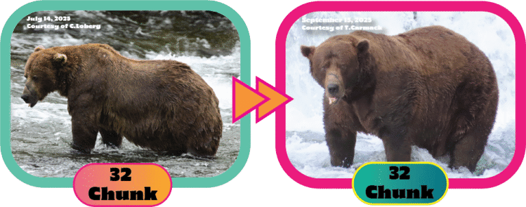 Fotos de antes y después de Chunk, el ganador de la Semana del Oso Gordo 2025. C. Loberg, T. Cormack, Candice Rusch/explore.org.