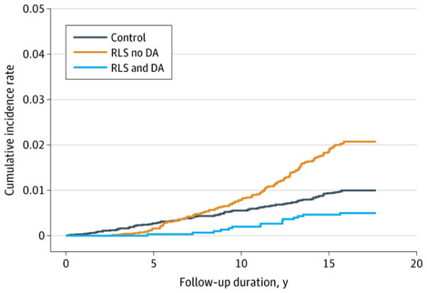 En el grupo con síndrome de piernas inquietas hubo una probabilidad significativamente mayor de que los miembros del grupo con síndrome de piernas inquietas desarrollaran la enfermedad de Parkinson en comparación con el grupo de control: una probabilidad del 1,6% en comparación con una probabilidad del 1%.