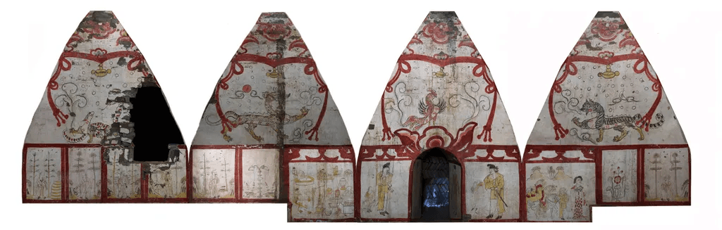 El techo abovedado presenta lo que podría ser un dragón y un fénix, criaturas míticas que simbolizan el poder y la inmortalidad. Cerca de la entrada de la tumba, figuras pintadas como “guardianes” visten túnicas amarillas, algunas de ellas portando espadas.
