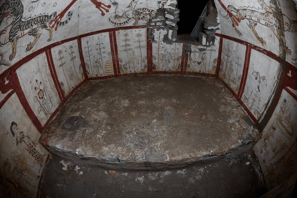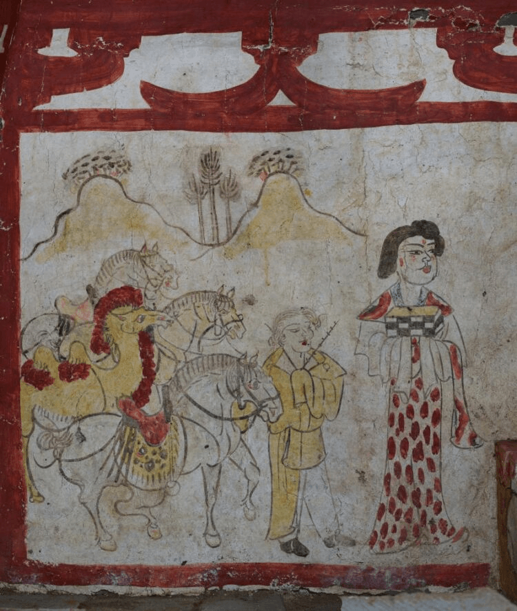 La tumba, descubierta en 2018 durante unas obras viales en una ladera cerca de Taiyuan, ha sido descrita con detalle recientemente por los arqueólogos. En su interior, los murales muestran escenas de tareas cotidianas que ofrecen una vívida imagen de la vida durante la dinastía Tang, un período conocido por sus logros culturales y artísticos. Una escena notable muestra a una mujer con un colorido vestido guiando tres caballos y un camello junto a un hombre que empuña un látigo.