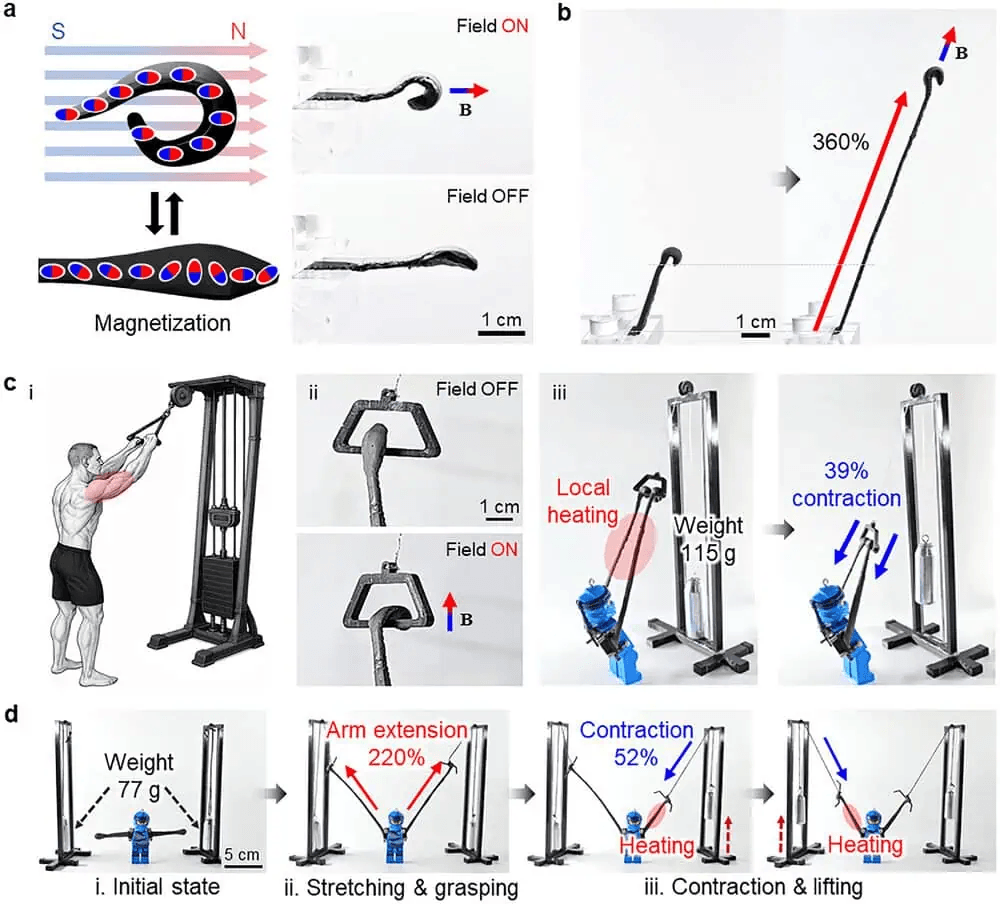 Ese es el principio básico de un nuevo músculo artificial desarrollado por investigadores del Instituto Nacional de Ciencia y Tecnología de Ulsan (UNIST) en Corea del Sur. En un estudio publicado en Advanced Functional Materials, describen un músculo blando, controlado magnéticamente, que puede alternar entre una contracción flexible y una firme, y que proporciona más energía de la que jamás podría generar el tejido muscular humano.