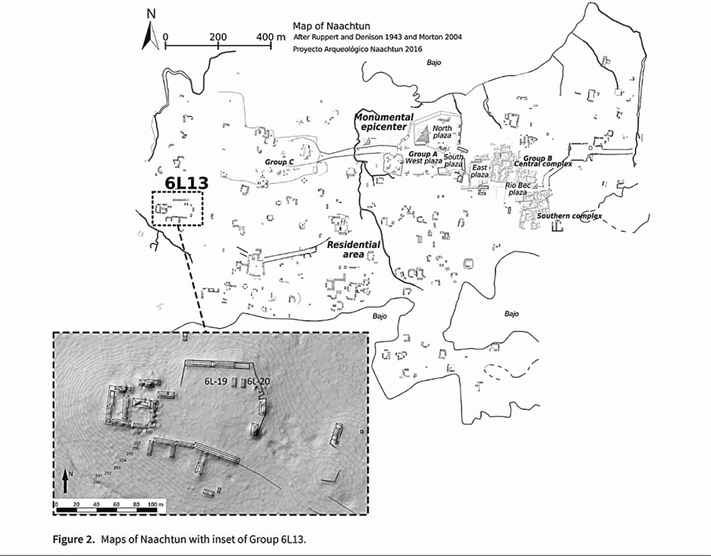 Mapas de Naachtun con recuadro del Grupo 6L13. Crédito: Latin American Antiquity (2025). DOI: 10.1017/laq.2025.10125.