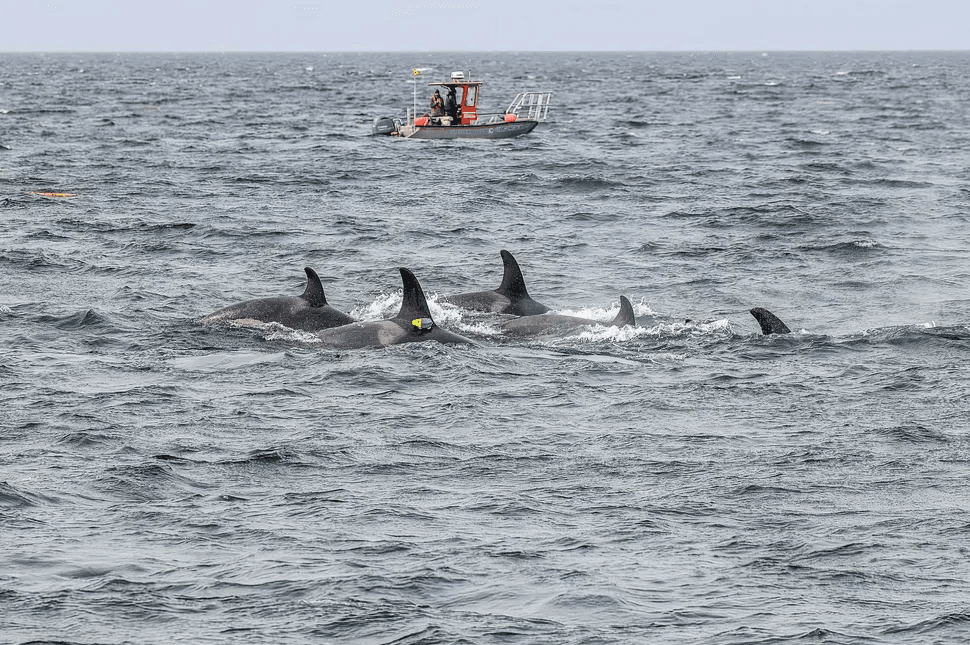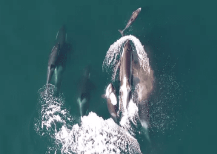 Los investigadores utilizaron videos submarinos, datos de etiquetas de biorregistro con ventosas y filmaciones aéreas con drones para establecer cómo se movieron y cazaron nueve orcas residentes del norte en agosto de 2020, y cómo interactuaron con delfines de lados blancos del Pacífico alrededor de la isla de Vancouver, Canadá. Capturaron imágenes aéreas y submarinas de las interacciones coordinadas de los animales. Las dos especies en esta zona generalmente muestran pocos signos de agresión mutua y, a veces, se buscan mutuamente, lo cual es inusual dado que las orcas cazan delfines en otros lugares, mientras que algunos delfines las acosan.