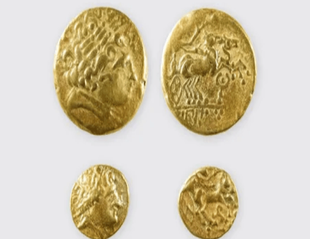 Sin embargo, las dos monedas recién descubiertas fueron ligeramente modificadas respecto a sus originales griegas. Por ejemplo, en el reverso de la más pequeña, se puede ver una triple espiral debajo de los caballos. Este símbolo, conocido como triskel (también llamado triskelion), aparece con frecuencia en el arte celta.