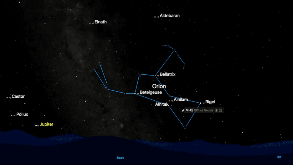 En las tardes de diciembre y enero, Orión sale temprano y domina el cielo austral al anochecer, lo que lo convierte en el punto de referencia invernal más fácil de observar. Mira al sureste para encontrar tres estrellas brillantes en una línea corta y recta: el Cinturón de Orión, formado por las tres estrellas equidistantes Alnitak, Alnilam y Mintaka.