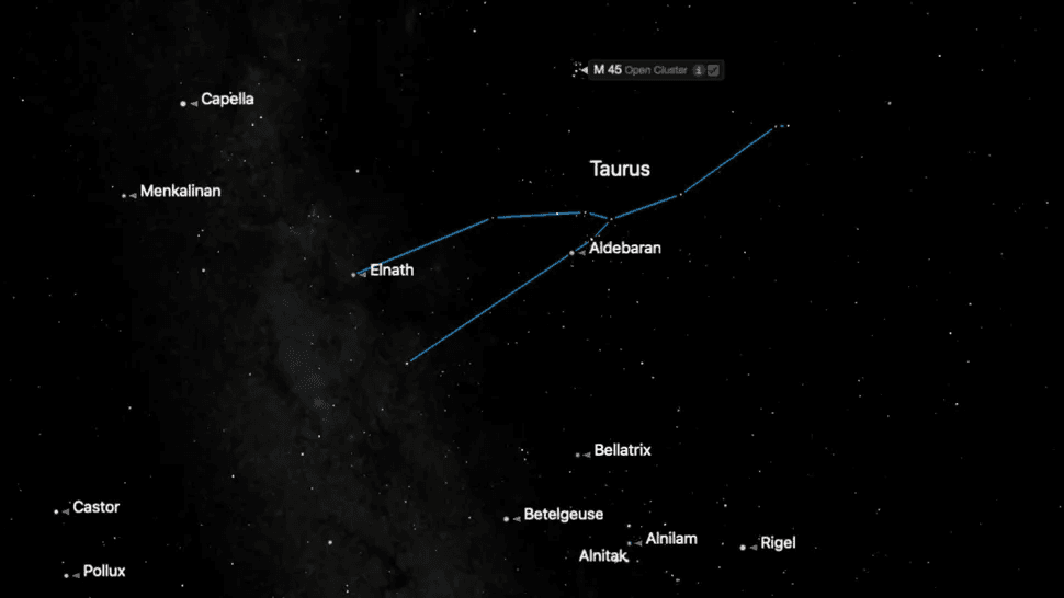 Al anochecer, mira hacia el este, sobre la constelación de Orión, para ver a Aldebarán, el ojo de Tauro, de color naranja. Se encuentra en un cúmulo en forma de V —el cúmulo abierto de las Híades—, que marca la cara del Toro. Debajo se encuentran sus cuernos, que se extienden hasta las estrellas Elnath y Tianguan.