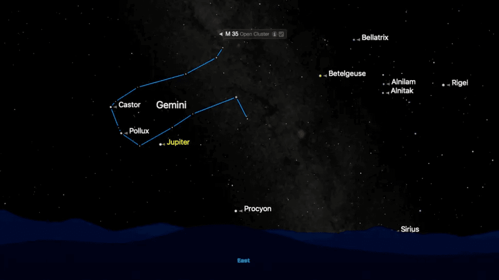 Como beneficio adicional este invierno, coloque un par de binoculares en el brillante Júpiter, que brilla intensamente cerca de Pólux en Géminis, para ver cuatro puntos de luz: sus lunas gigantes Ganimedes, Europa, Calisto e Ío.