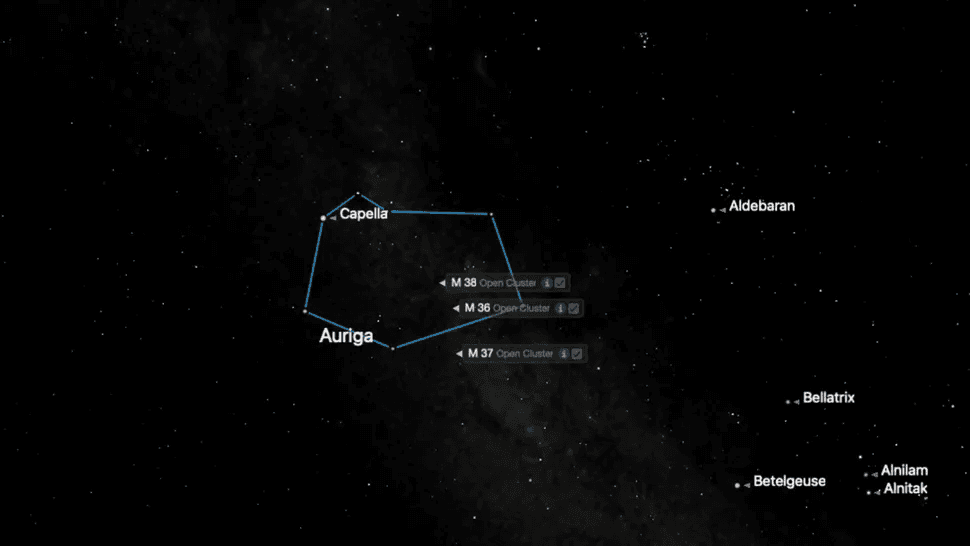 Examina el área sur debajo de Capella con binoculares o un telescopio pequeño y encontrarás M36, M37 y M38: tres cúmulos brillantes y abiertos que convierten un cielo aparentemente vacío en todo lo contrario.
