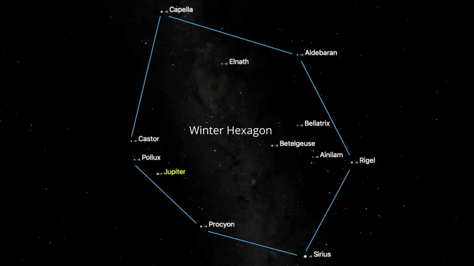 Retrocede y únete a las deslumbrantes estrellas del cielo austral: Rigel en Orión, Aldebarán en Tauro, Capella en Auriga, Pólux en Géminis, Proción en Canis Minor y Sirio en Canis Major. Juntas forman el enorme Hexágono Invernal (o Círculo Invernal). Es una figura enorme que cuesta un poco encontrar, así que tómate tu tiempo y repite tus saltos de estrella una y otra vez hasta que la memorices. Te acompañará para siempre y te hará desear el invierno con ansias.