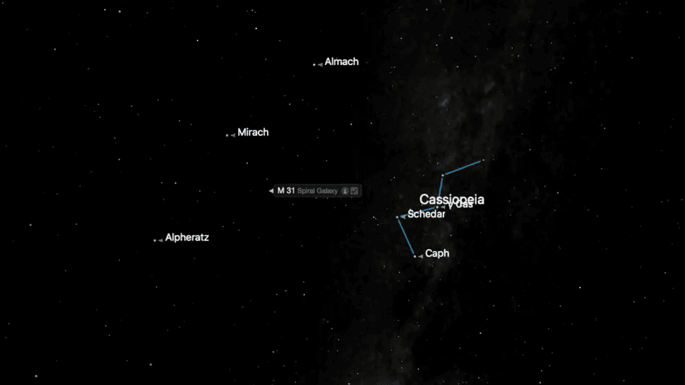 Desde la V central del O, dirígete hacia el sur con binoculares o un telescopio pequeño para encontrar M31, la galaxia de Andrómeda. Esta galaxia espiral, a 2,5 millones de años luz de distancia, se presenta como un resplandor suave y alargado, aunque cuanto más oscuro sea el lugar desde el que observes las estrellas, más brillante se verá.