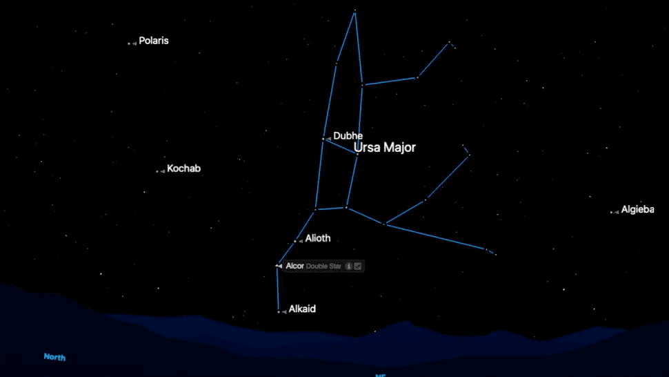 En las tardes de finales de diciembre, la Osa Mayor se encuentra baja en el noreste y asciende después de la medianoche. Observe la forma brillante de una cacerola: tres estrellas en el asa y cuatro en el cuenco. Mizar, la estrella central del asa, se ve ligeramente borrosa a simple vista.