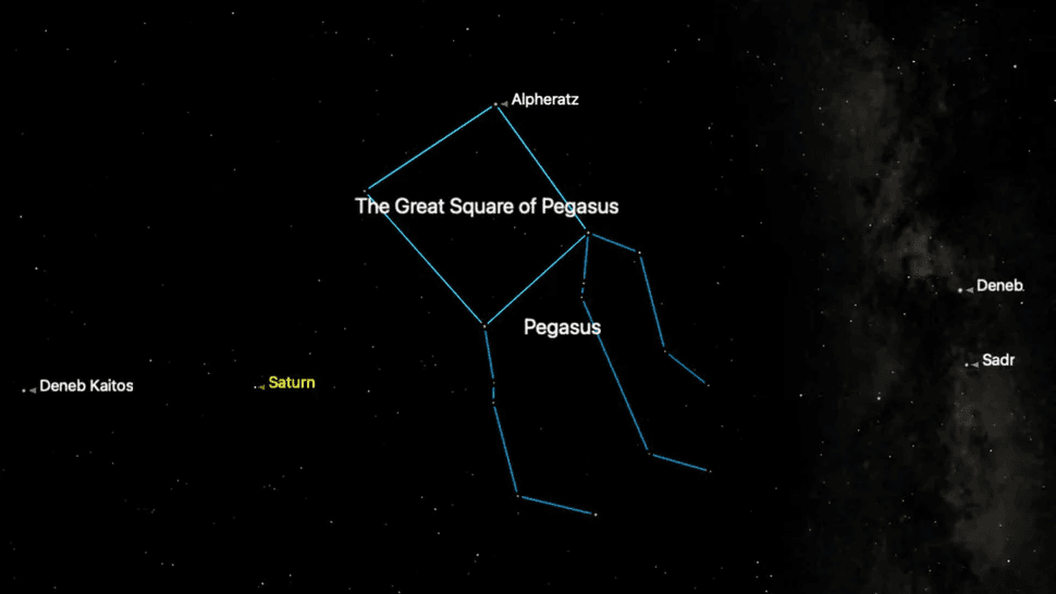 En las primeras noches de invierno, mira hacia el oeste para ver un gran cuadrado casi vacío de cuatro estrellas de brillo medio (Markab, Scheat, Algenib y Alpheratz), que forman el vasto Gran Cuadrado de Pegaso. A finales de diciembre, se hunde, pero aún es visible en la primera mitad de la noche.