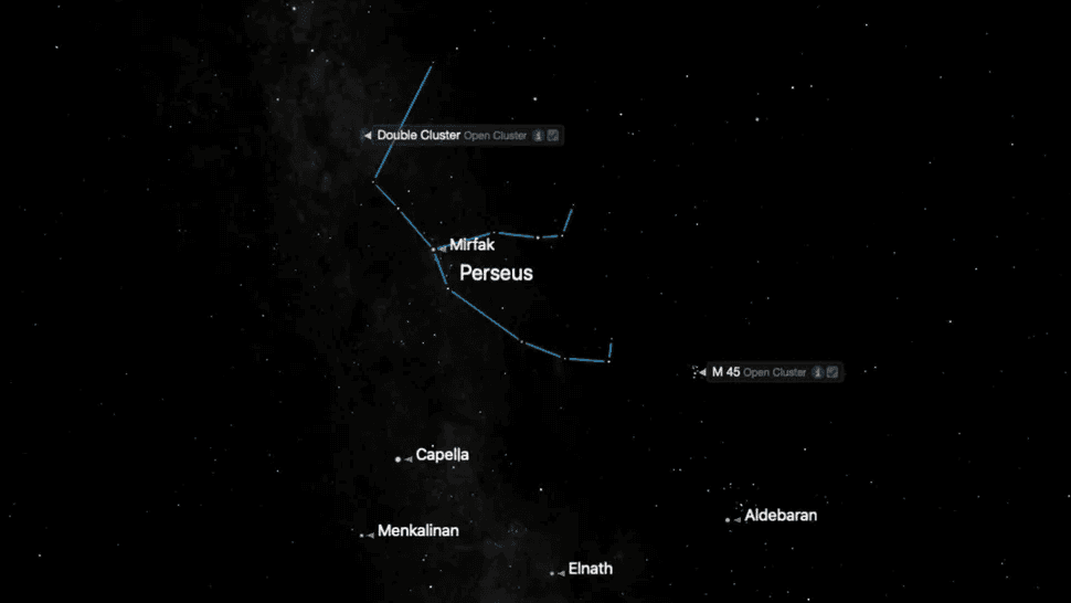Busca entre Casiopea, al norte, y Capella, al noreste, una cadena de estrellas irregular y curva: la constelación de Perseo. Recorre la franja pálida de la Vía Láctea invernal en esta época del año y contiene una gran riqueza.
