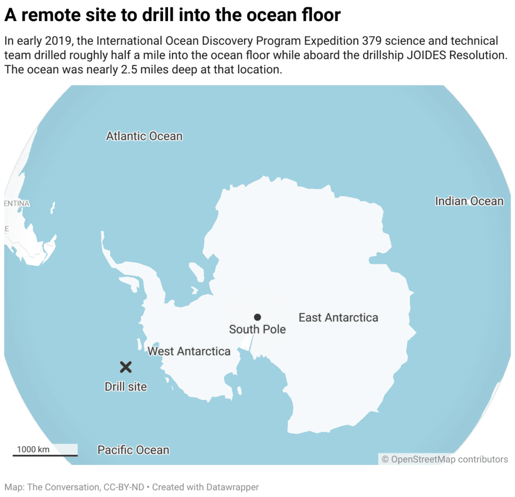A principios de 2019, nos unimos a un importante viaje científico —la Expedición 379 del Programa Internacional de Descubrimiento Oceánico— al mar de Amundsen, al sur del océano Pacífico. Nuestra expedición tenía como objetivo recuperar material del fondo marino para comprender qué había sucedido en la Antártida Occidental durante su período de deshielo hace tanto tiempo.