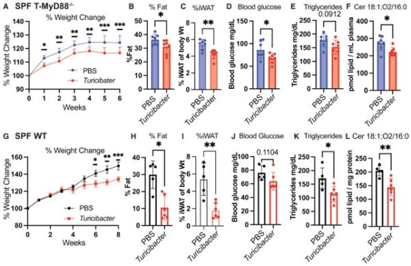 Dado que Turicibacter protege contra los efectos perjudiciales de las dietas ricas en grasas pero también se ve afectado por ellas, los niveles de Turicibacter deben mantenerse mediante una suplementación regular. De hecho, cuando a los ratones se les administró un suplemento oral de Turicibacter cinco días a la semana, mostraron un menor aumento de peso, niveles más bajos de glucosa en reposo, reducción de grasa corporal y otros cambios favorables en los perfiles lipídicos, incluso cuando todavía se les alimentaba con una dieta rica en grasas.