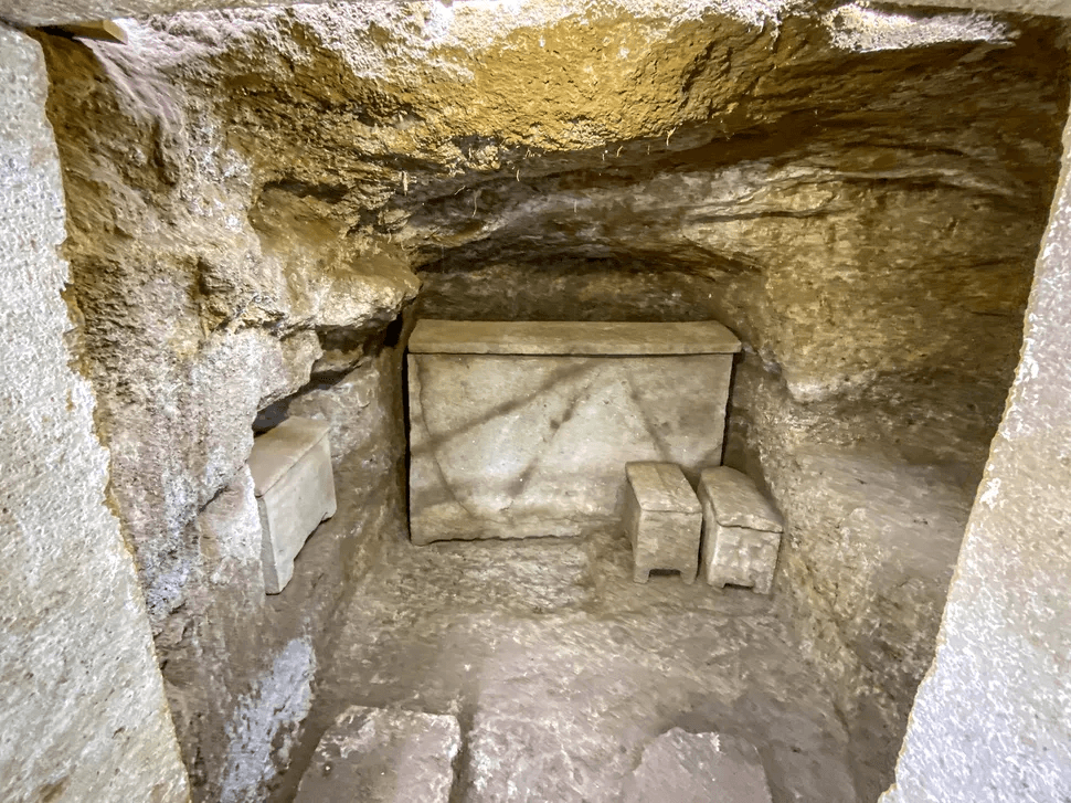 Una de las tumbas recién descubiertas contiene un sarcófago de piedra y tres urnas de cremación, y la otra contiene un esqueleto masculino adulto. Crédito de la imagen: Ministerio de Cultura Italiano.