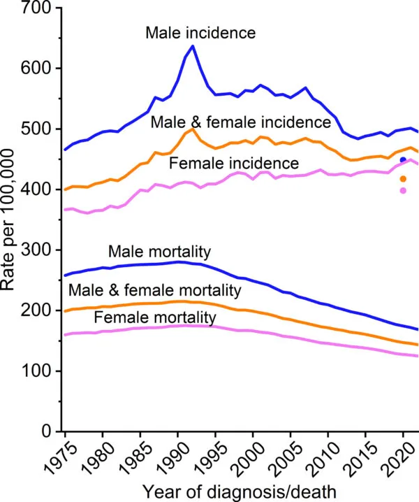 El cáncer es la segunda causa principal de muerte en los EE. UU., detrás de las enfermedades cardíacas, pero las tasas generales de supervivencia a cinco años han alcanzado ahora sus niveles más altos, aumentando del 49% para los diagnósticos durante la década de 1970 al 70% para los diagnósticos durante 2015-2021. Además, los mayores avances en las tasas de supervivencia se observaron en los cánceres que se han propagado a otras partes del cuerpo, con tasas que se duplicaron, pasando del 17% a mediados de la década de 1990 al 35% durante el período 2015-2021. Las tasas de supervivencia variaron según los tipos de cáncer.
