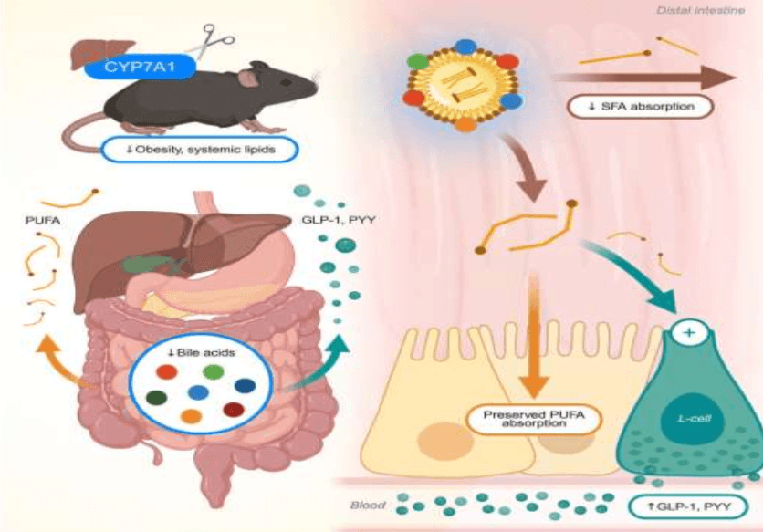 A continuación, el equipo se preguntó si los cambios en la grasa hepática se debían a la absorción de las diferentes grasas, en lugar de a que los ratones simplemente consumieran menos grasa en general. Al rastrear la absorción de ácidos grasos individuales, descubrieron que los ratones CRISPR Cyp7a1 seguían absorbiendo grasas poliinsaturadas buenas, mientras que permitían que más grasas saturadas malas pasaran a las heces, un patrón que coincidía con lo observado en los tejidos.