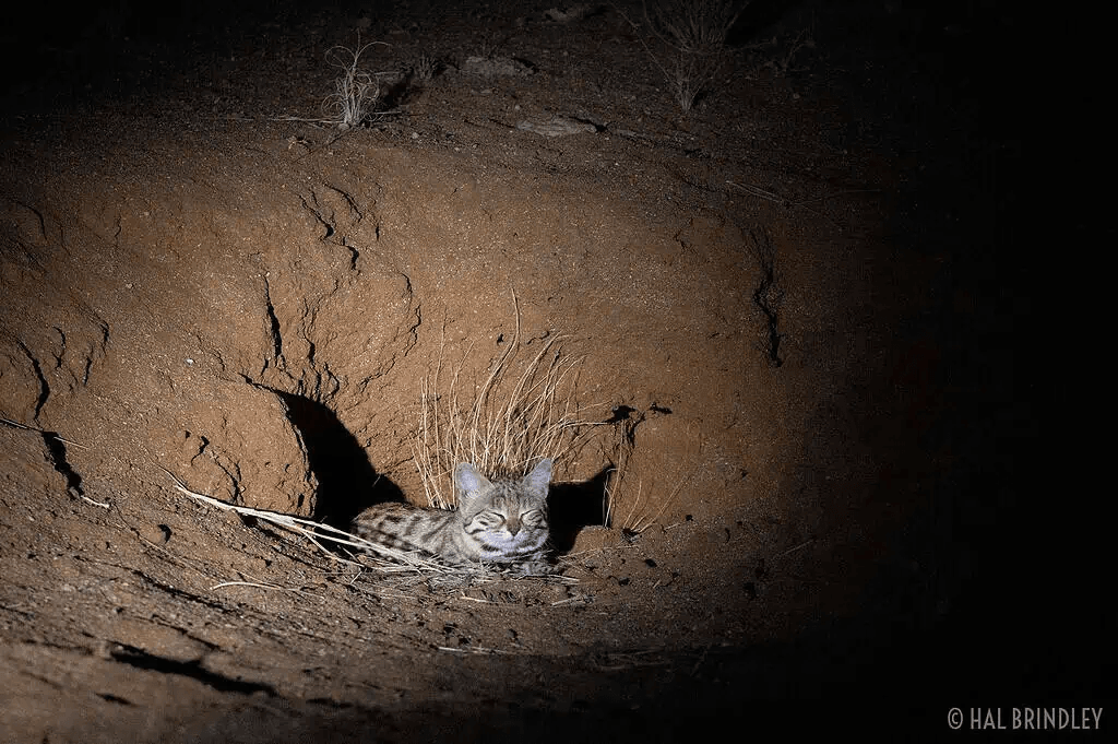 Brindley y su equipo, incluyendo a Sliwa, rastrearon a cinco gatas con collares de radio y escanearon más de 50 madrigueras en el sur de Namibia mediante tecnología lidar láser. Descubrieron que cada gata utilizó un promedio de 12 refugios diferentes durante los 138 días del estudio, permaneciendo en cada madriguera una media de dos días consecutivos. Las madres que criaban gatitos seguían un ritmo diferente: antes de que las crías cumplieran aproximadamente seis semanas de edad, las hembras solían permanecer en la misma madriguera unos seis días. Una vez que los gatitos empezaron a viajar con sus madres por la noche —alrededor de las seis o siete semanas— cambiaban de refugio casi a diario.