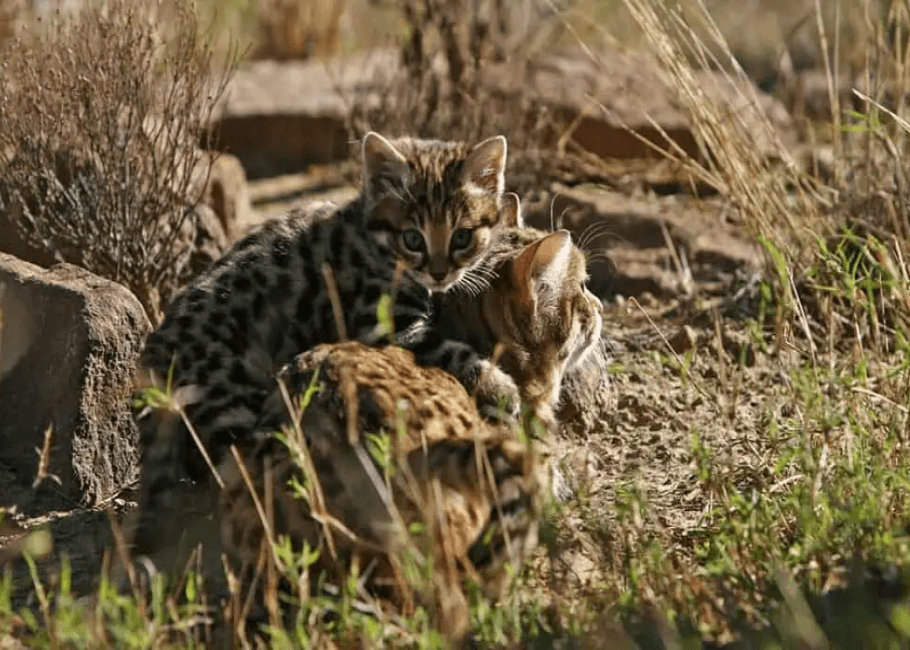 Una investigación recientemente publicada, centrada en la actividad diurna de los felinos, ha revelado su gran dependencia de las madrigueras excavadas por las liebres saltadoras (Pedetes capensis), un roedor de gran tamaño, para criar a sus crías. Las hembras de gato de patas negras rotan entre múltiples guaridas, y una vez que los cachorros comienzan a mudarse, las madres cambian de refugio casi a diario, probablemente para reducir el riesgo de depredación y evitar dejar rastros que los depredadores puedan seguir. La supervivencia en este paisaje duro y semiárido depende no sólo del sigilo y de la habilidad de cazar, sino también de estas interdependencias ocultas.