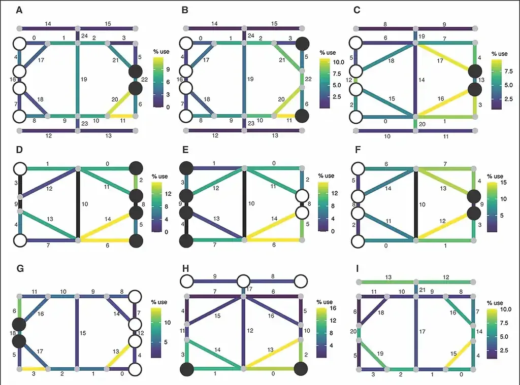 Resultados de la simulación de IA que muestra nueve posibles tableros de juego. En estos juegos, el jugador con más piezas intenta bloquear al jugador con menos. Crist et al./Antiquity.