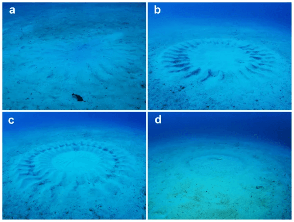 El pez globo macho excava un complejo patrón de valles y picos en círculo, y decora estos con fragmentos de concha. El resultado es ciertamente impresionante: un anillo de intrincadas marcas arenosas rodea la zona central de arena fina, perfecta para desovar.