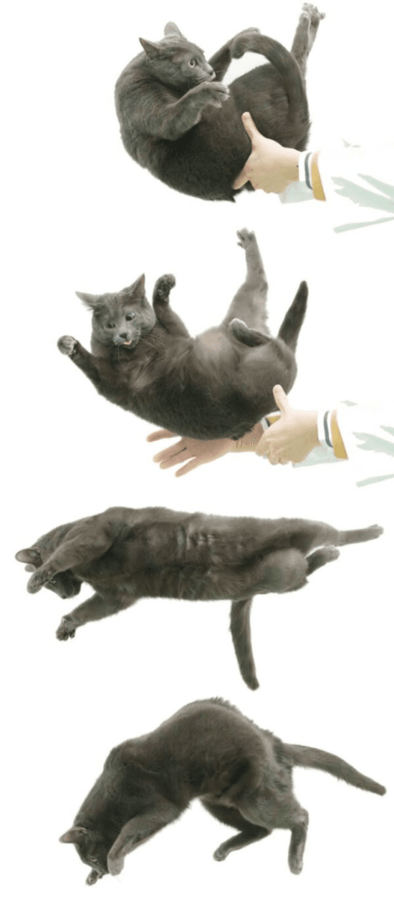 Este fenómeno se conoció rápidamente como el “problema del gato que cae” en física. No fue hasta 1969 que los investigadores demostraron matemáticamente que un gato puede reorientarse en el aire girando diferentes partes de su cuerpo entre sí, lo que le permite rotar incluso conservando el momento angular.