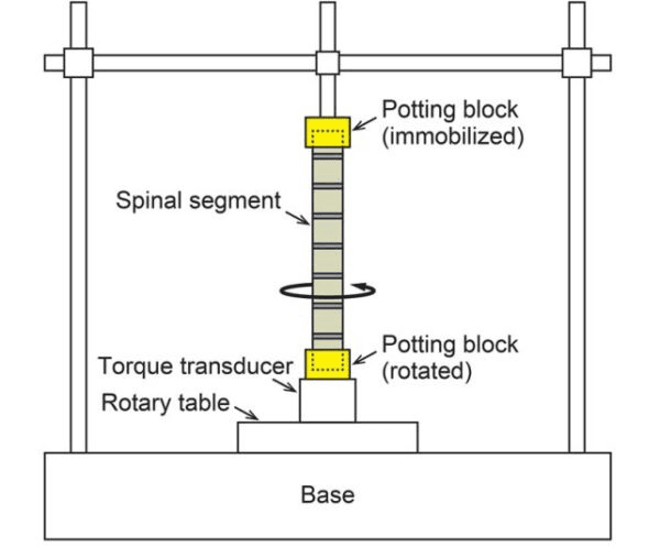 Cada columna se dividió en dos regiones: las vértebras torácicas y las lumbares. Posteriormente, cada una de las diez secciones espinales se colocó en una plataforma de torsión para comprobar literalmente su alcance de torsión.