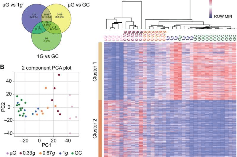El equipo también identificó genes sensibles a la gravedad comparando los resultados de la secuenciación de ARN del grupo μG con los de los grupos 1g y GC. Se observaron varios cambios entre los grupos, algunos de los cuales sugieren que la exposición a μG y 0,33g suprime la síntesis de proteínas y modifica la demanda metabólica entre diferentes procesos. Otros indicaron la activación de vías de atrofia muscular y cambios en las características metabólicas entre distintos tipos de miofibras. En general, sin embargo, los resultados sugirieron efectos protectores a 0,67g y cierta protección parcial a 0,33g, lo que concuerda con otras observaciones.
