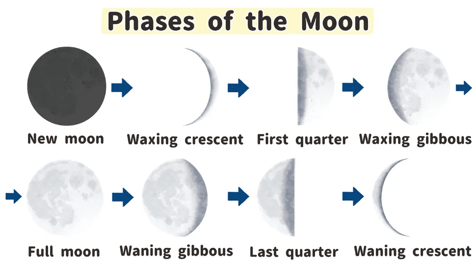 Las fases de la luna durante cada ciclo lunar —el ciclo de 29,5 días que va desde la luna llena hasta la luna nueva y viceversa— también difieren entre los hemisferios norte y sur.