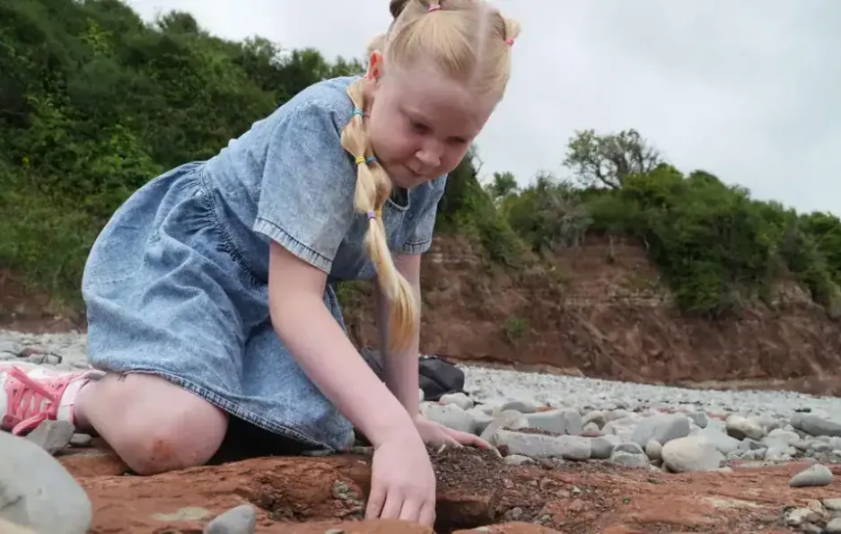 Un insólito descubrimiento de fósiles comenzó con un paseo lúdico por una playa del sur de Gales, cuando una niña de 10 años se fijó en una serie de marcas inusuales grabadas en la roca: demasiado grandes, demasiado espaciadas uniformemente y demasiado deliberadas como para ser aleatorias.