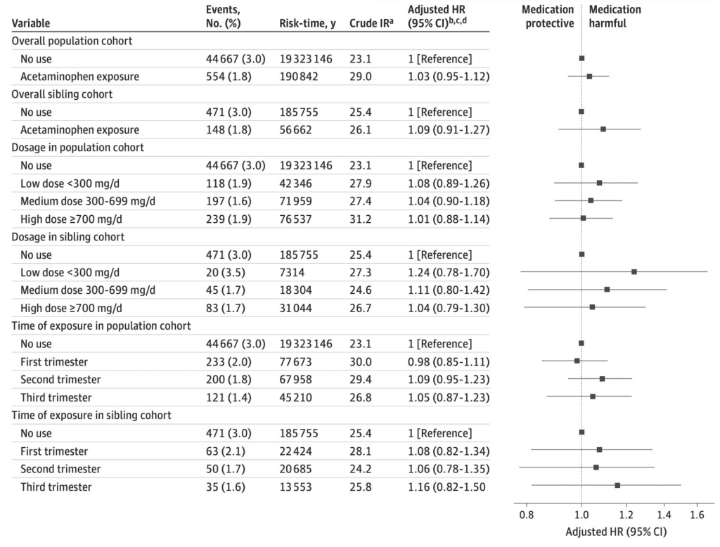 Los investigadores descubrieron que tomar paracetamol durante el embarazo no está relacionado con un mayor riesgo de autismo en los niños. Los resultados fueron los mismos para la población general y para las comparaciones entre hermanos. El cociente de riesgos ajustado —una medida del riesgo relativo entre dos grupos— fue cercano a 1, lo que indica que no hay un mayor riesgo.